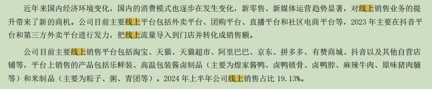 去年9月,絕味鴨脖在抖音連續(xù)直播,交易額超過6600萬,創(chuàng)下多個行業(yè)交易紀(jì)錄,但絕味食品2023年來自線上的收入占比才不到2%。周黑鴨這一數(shù)據(jù)在14%左右;煌上煌線上業(yè)務(wù)比例更高一些,今年上半年達(dá)到了19.1%。