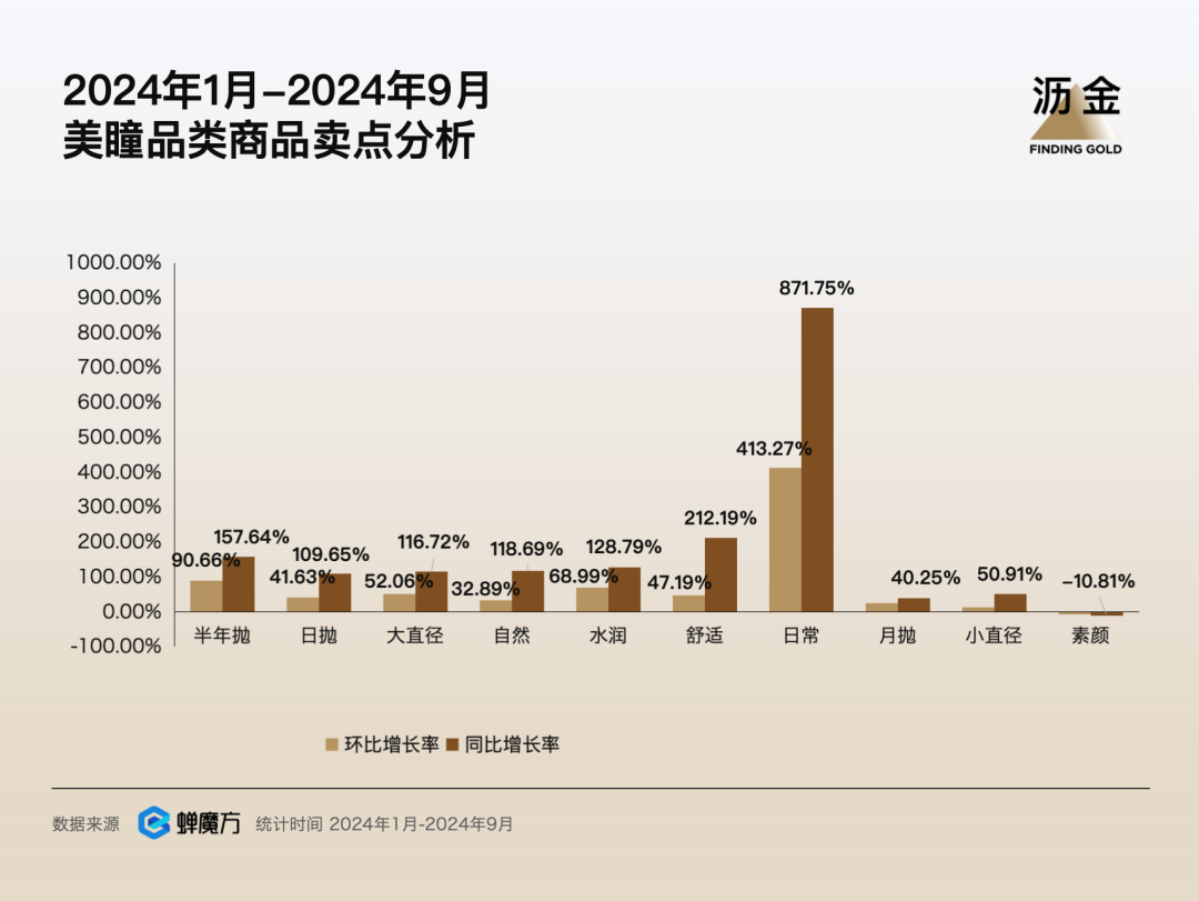 另一方面,半年拋美瞳的賣點漲勢迅猛,從2023年和日拋賣點并駕齊驅(qū),上漲到如今的一騎絕塵。