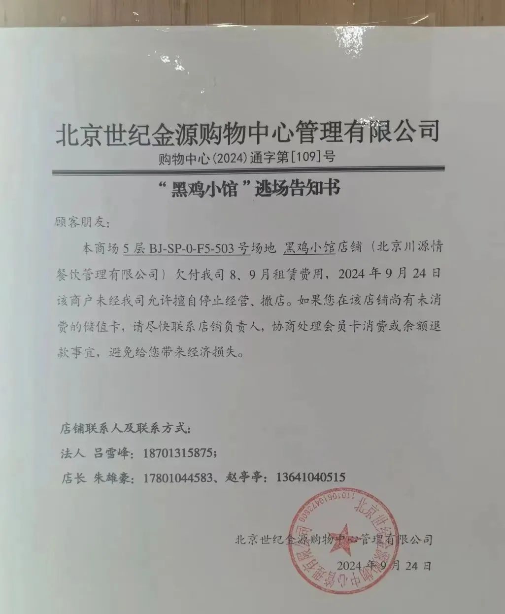 而就在9月24日,國(guó)慶前,商場(chǎng)方又發(fā)布了另一則《逃場(chǎng)告知書(shū)》,表示黑雞小館欠了兩個(gè)月房租,而且擅自停止經(jīng)營(yíng)、撤店。