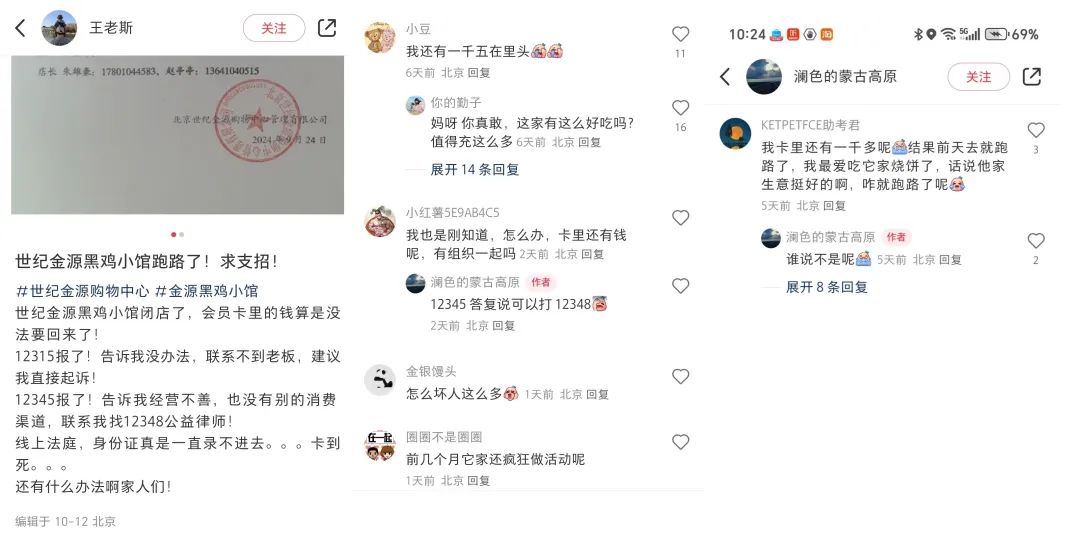 與此同時(shí),很多網(wǎng)友在社交平臺(tái)申訴,說(shuō)自己千元的儲(chǔ)值卡無(wú)法退還,黑雞小館總部電話打不通,聯(lián)系不到老板,無(wú)人回應(yīng)。