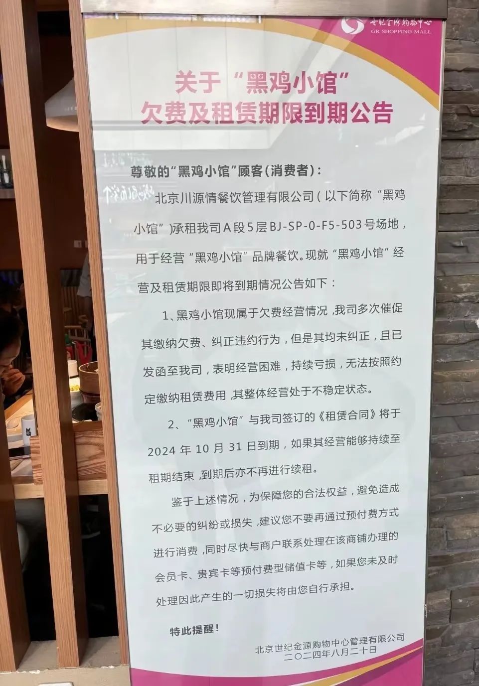 起因是8月份,北京世紀(jì)金源商場(chǎng)在黑雞小館門(mén)口發(fā)布了一則《欠費(fèi)及租賃到期公告》。