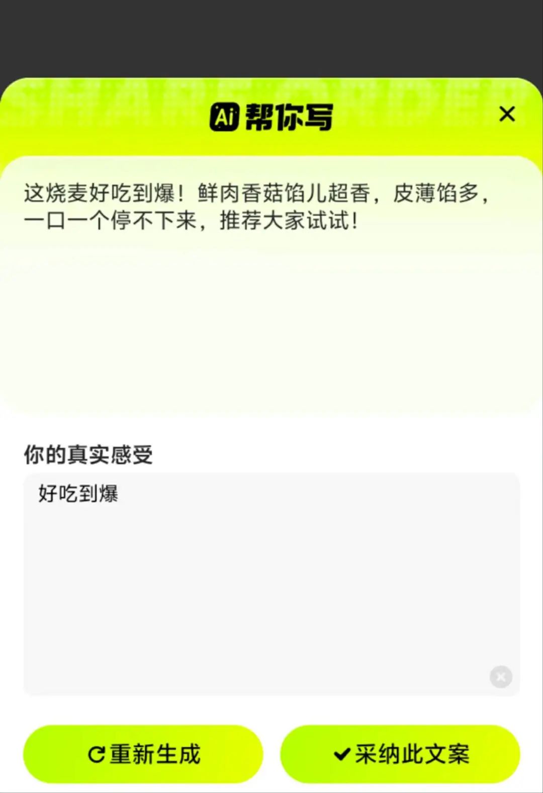 如果沒有很好的創(chuàng)作思路,也可以選擇“AI幫你寫”的功能。輸入簡短的文案后,AI會結(jié)合訂單內(nèi)容,生成一段用餐感受。