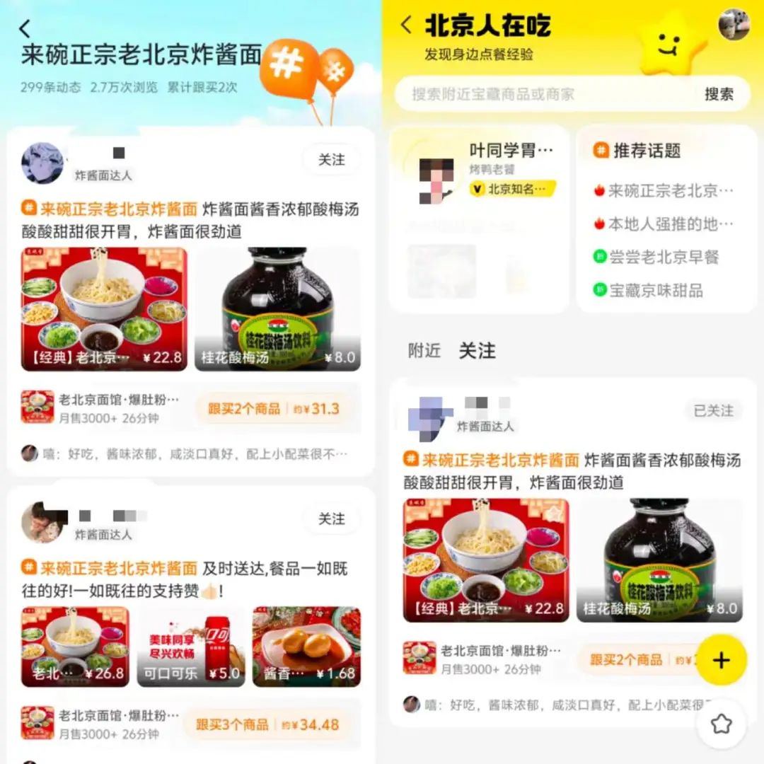 以定位北京為例,進入“本地在吃”服務(wù)后,即可來到服務(wù)界面。首先看到是KOL的內(nèi)容推薦,以及推薦話題。KOL為平臺篩選出的推薦官,內(nèi)容更為優(yōu)質(zhì)。而在推薦話題中,則是一些熱門的話題內(nèi)容,譬如,在“來碗正宗老北京炸醬面”中,會顯示一些美食達人創(chuàng)作的符合話題的種草內(nèi)容,可對他們進行關(guān)注。