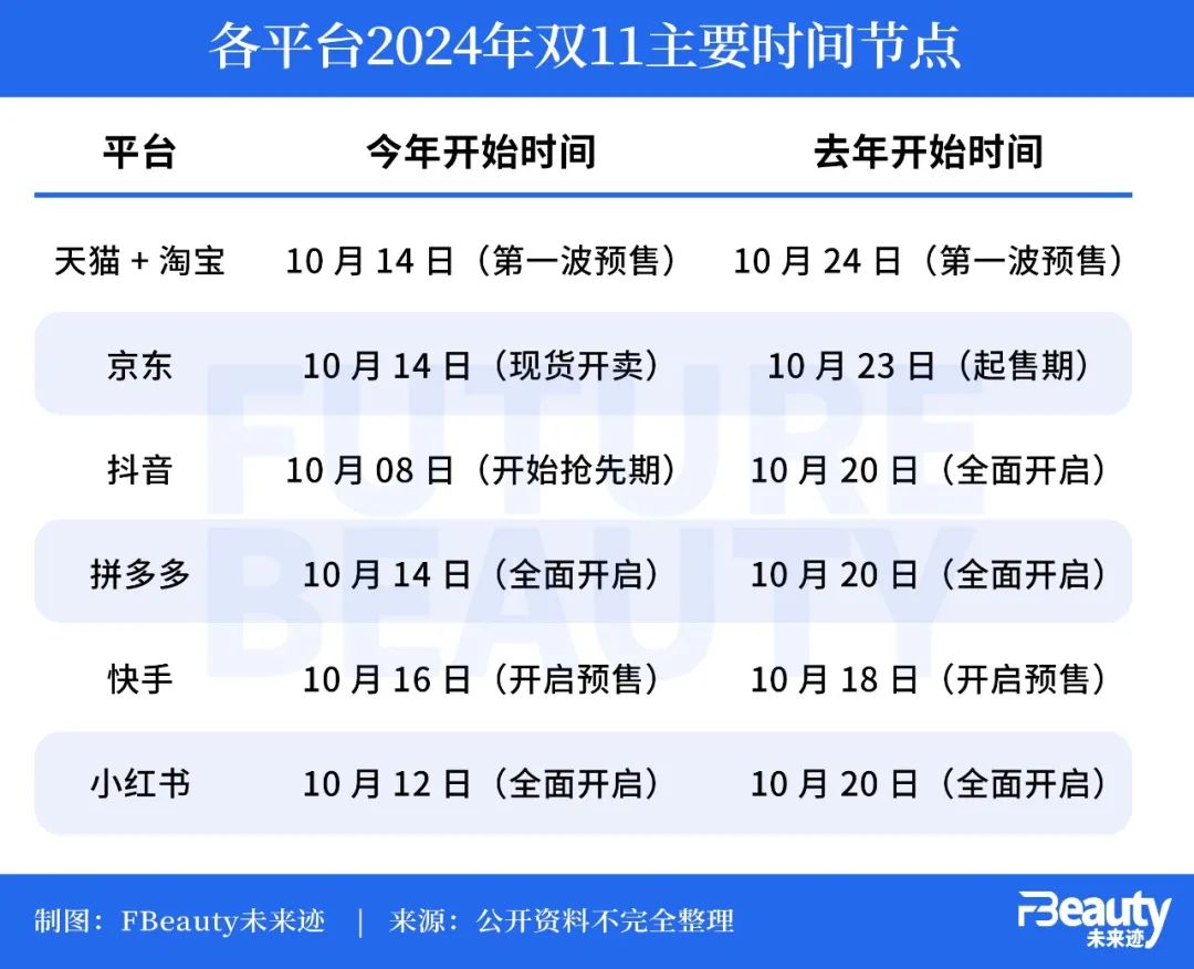 今年雙11,各平臺紛紛將開始的時間提前,淘天恢復(fù)了預(yù)售機制,并將預(yù)售時間提前了10天;京東原本在10月10日突然宣布時間再次提前,即在10月14日晚8點現(xiàn)貨開賣,直接對上當(dāng)日開啟預(yù)售的淘天。