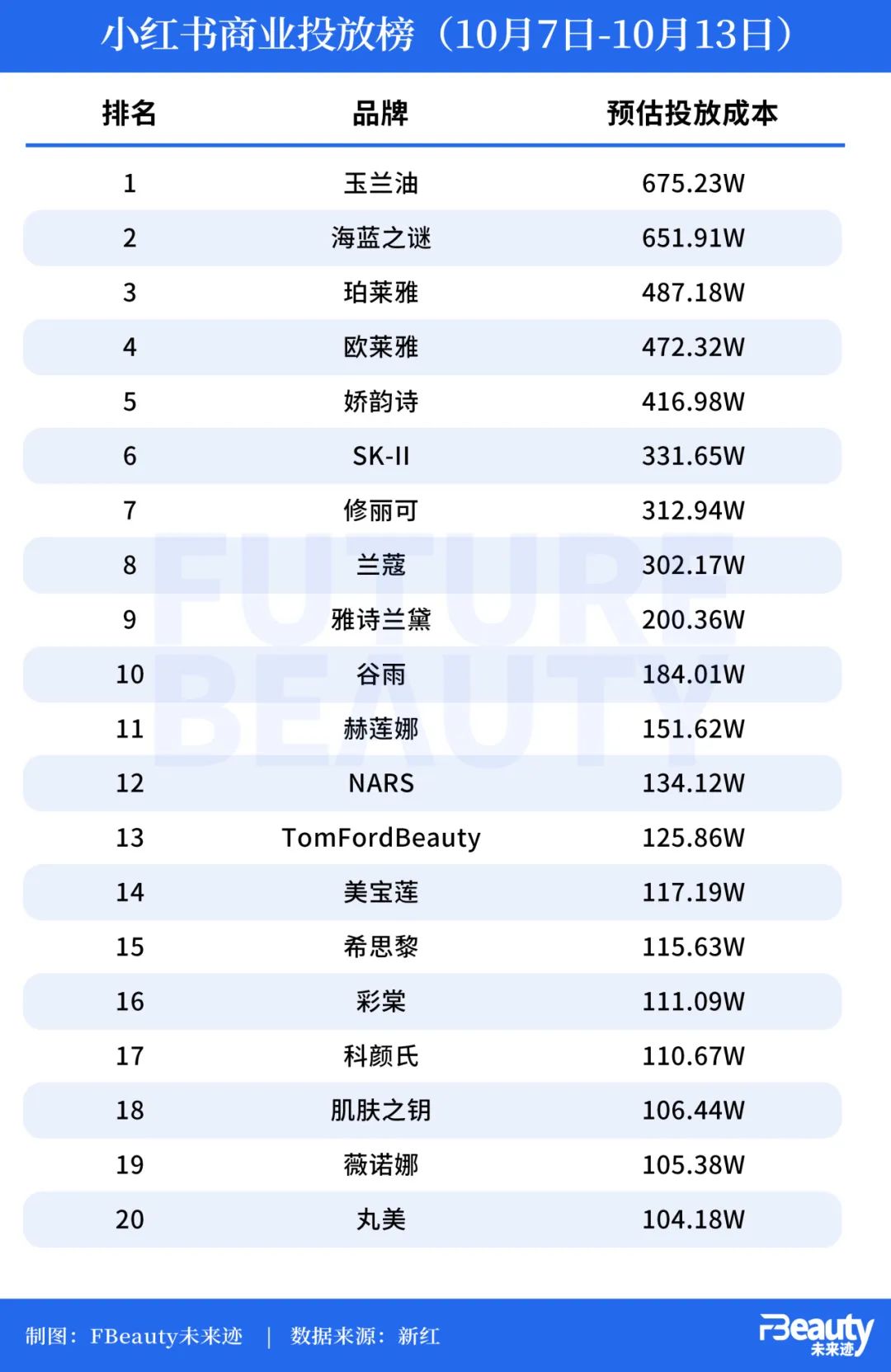 就品牌來看,投放金額在Top8的品牌:玉蘭油、海藍之謎、珀萊雅、歐萊雅、嬌韻詩、SK-II、修麗可和蘭蔻,它們不僅是美妝護膚內(nèi)容(預(yù)估)投放成本最高的品牌,在所有類目中也遙遙領(lǐng)先,投放金額遠超其他品類(比如京東、拼多多等平臺類,華為、海爾、美的等3C家電類),成為全行業(yè)當(dāng)之無愧的營銷“卷王”。