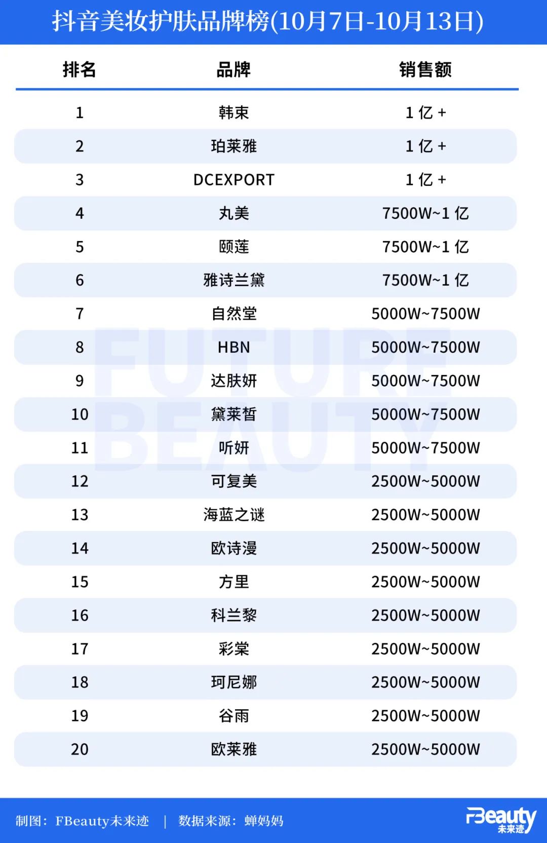 從最先搶跑的抖音數(shù)據(jù)看,過去一周Top10美妝護膚品牌分別是:韓束、珀萊雅、DCEXPORT、丸美、頤蓮、雅詩蘭黛、自然堂、HBN、達膚妍、黛萊皙;Top10-Top20品牌分別是:聽妍、可復(fù)美、海藍之謎、歐詩漫、方里、科蘭黎、彩棠、珂尼娜、谷雨、歐萊雅。
