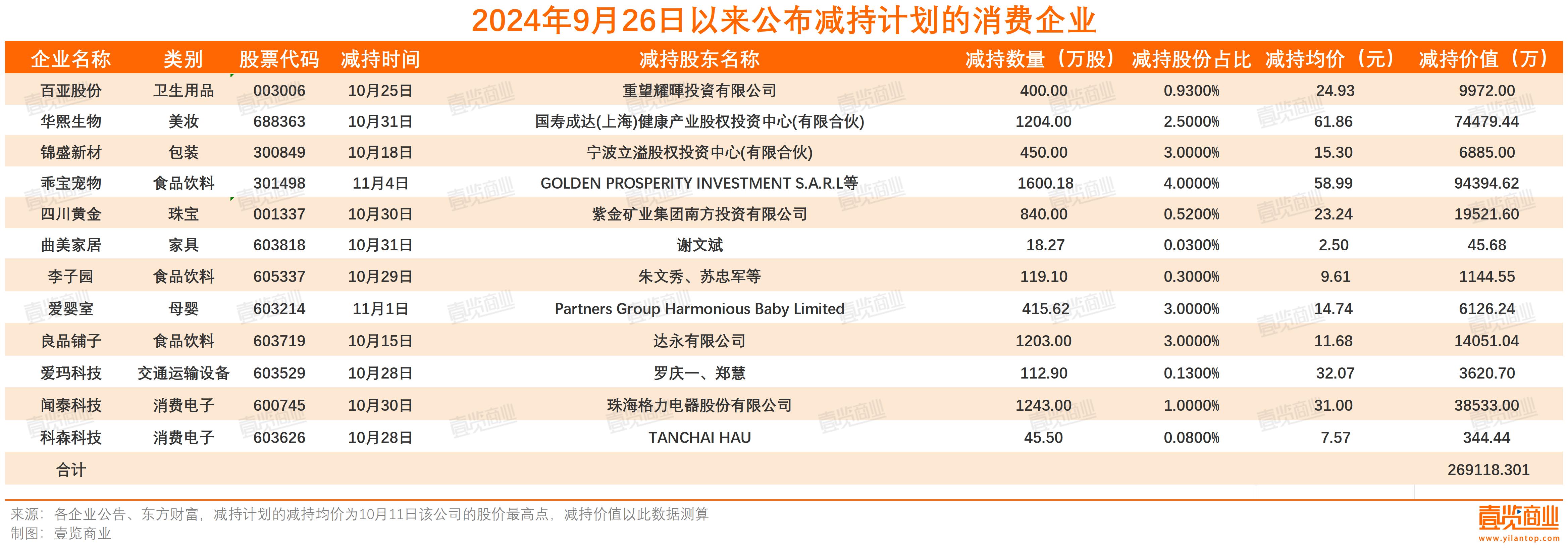 壹覽商業(yè)統(tǒng)計(jì)發(fā)現(xiàn),28家消費(fèi)企業(yè)中,有12家消費(fèi)企業(yè)股東公布減持計(jì)劃,按照10月11日各公司股票收盤價(jià)格進(jìn)行測算,擬減持價(jià)值達(dá)26.91億元,是已減持價(jià)值的三倍多。