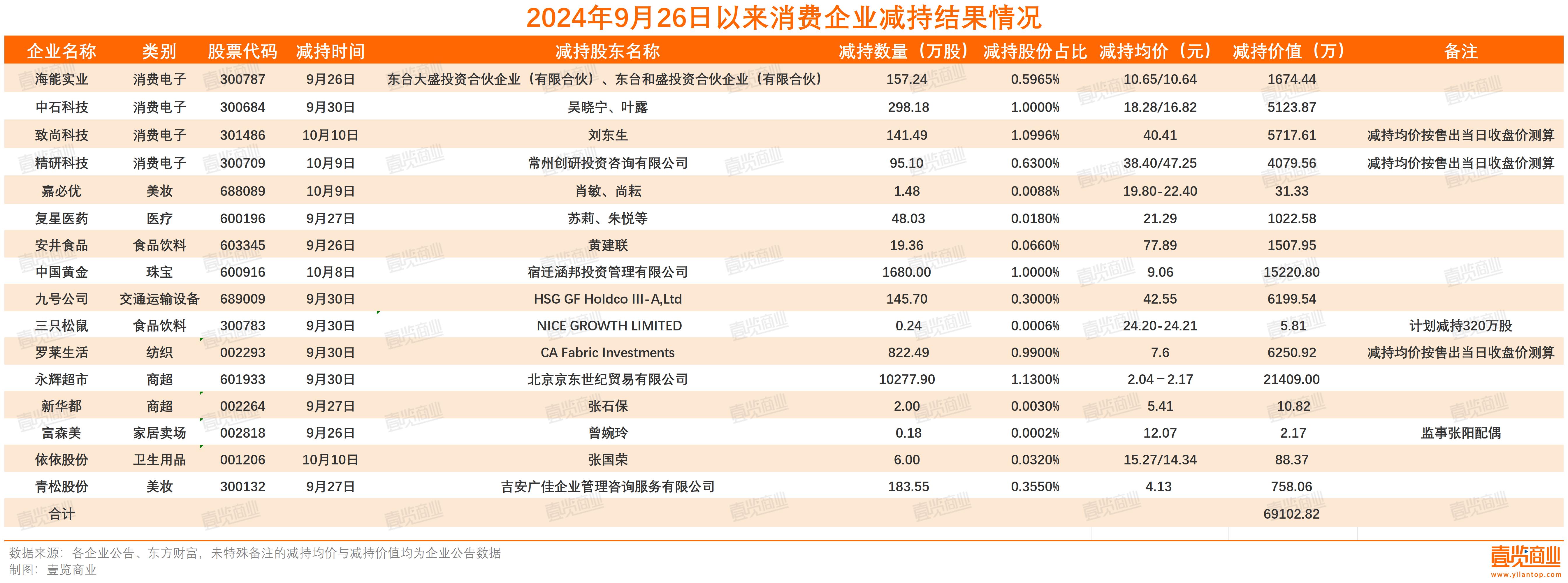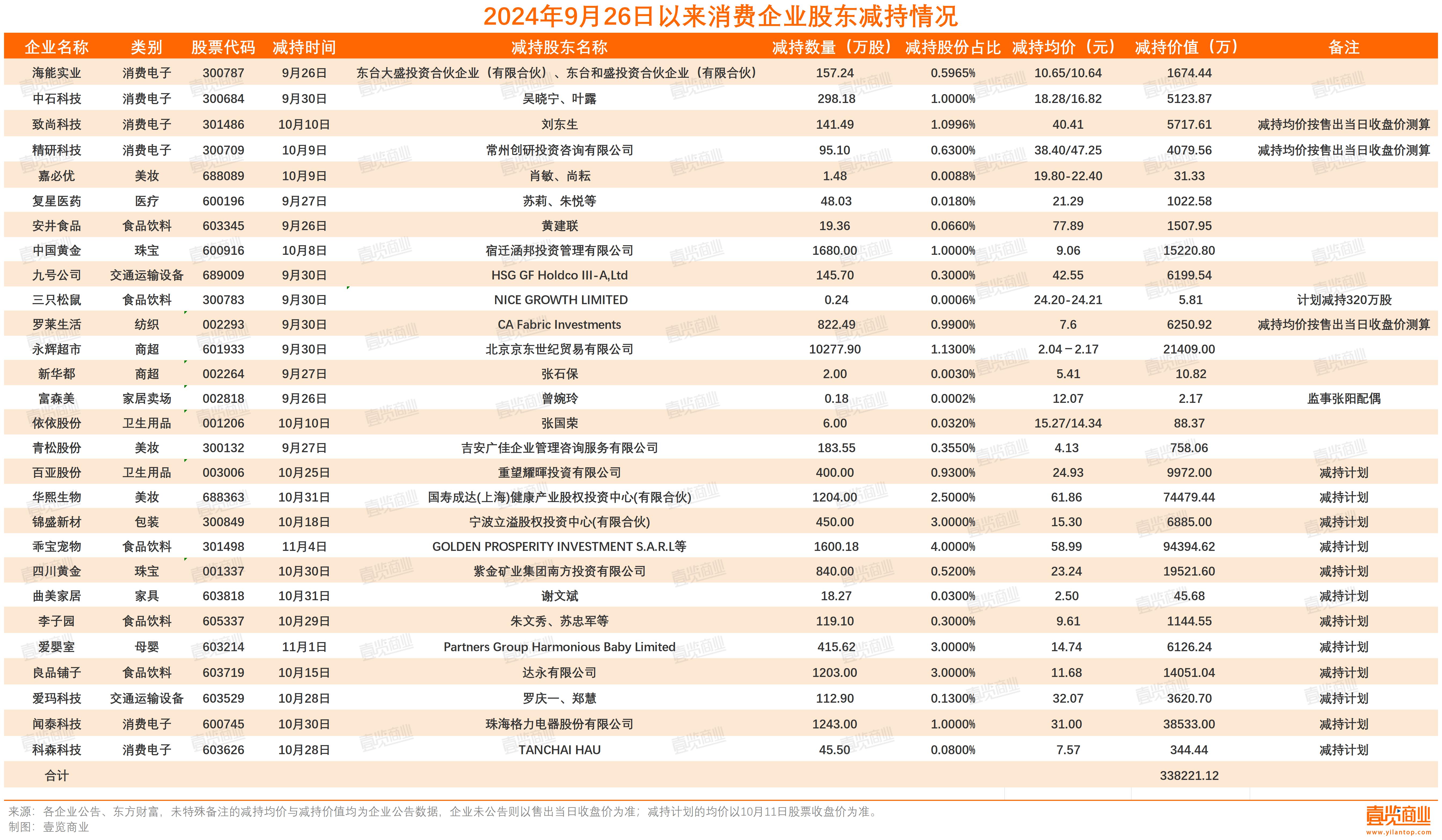 在股市初顯“牛氣”之際,不少股東趁著自家公司股票大漲開始減持。據(jù)壹覽商業(yè)不完全統(tǒng)計(jì),9月26日以來,至少有28家消費(fèi)企業(yè)披露減持結(jié)果或公布未來減持計(jì)劃,涉及消費(fèi)電子、食品飲料、美妝、商超等行業(yè),總減持資金超33億。