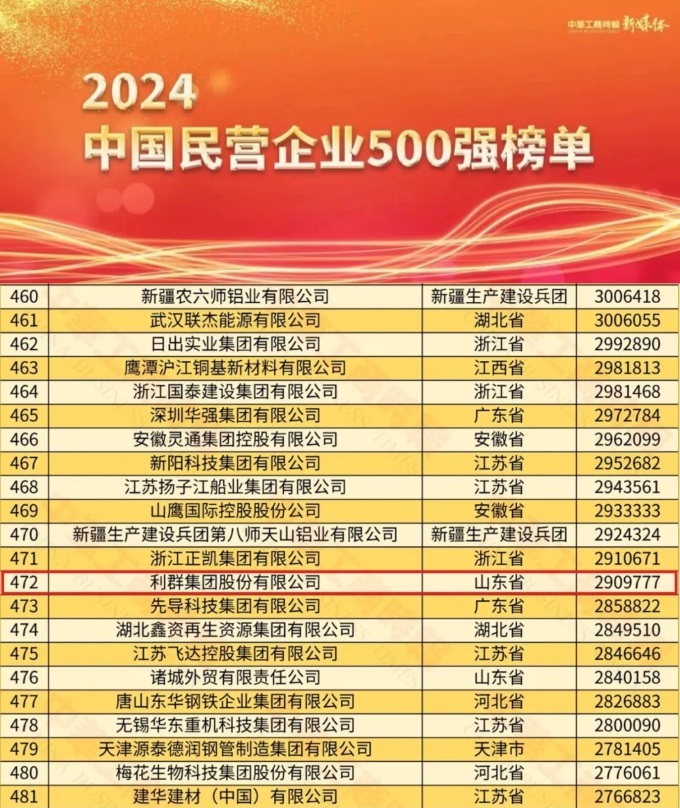 利群集團(tuán)榮列“2024中國民營企業(yè)500強(qiáng)”第472位