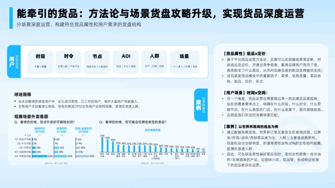 在門店流量競(jìng)爭(zhēng)日益激烈的當(dāng)下,貨品成為最重要的增長(zhǎng)承接。餓了么提出了平臺(tái)專屬的貨品運(yùn)營(yíng)方法論,希望可以幫助門店組品選擇,實(shí)現(xiàn)對(duì)不同人群推薦特定菜品,并且基于競(jìng)爭(zhēng)視角和用戶需求,結(jié)合平臺(tái)多年的數(shù)據(jù)沉淀和算法能力,共同進(jìn)行新品研發(fā)。以世界杯期間的組品為例,數(shù)據(jù)洞察發(fā)現(xiàn),世界杯訂單主要發(fā)生在夜宵時(shí)段,以烤串/炸雞/鹵味/西快等品類為主,人群上主要是成熟男性。但是機(jī)會(huì)點(diǎn)也很明顯,即通常男性會(huì)有20%的女性陪同觀賽,是潛在滲透人群。因此,可在研發(fā)男性偏好菜品同時(shí),面向女性搭售一些非油炸/非啤酒類的產(chǎn)品,如甜味小吃、飲品等,形成特定場(chǎng)景下、面向不同人群的貨品差異化運(yùn)營(yíng)方案。