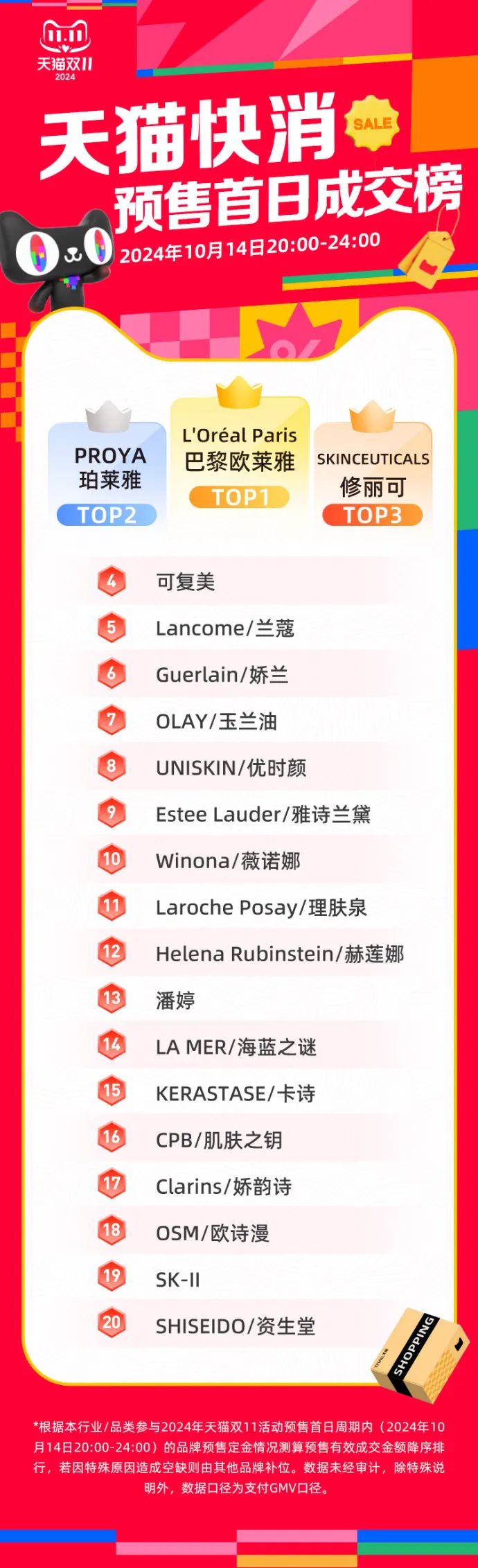 根據(jù)“天貓美妝預(yù)售首日成交榜”(10月14日20:00-24:00),前三名的品牌分別為珀萊雅、巴黎歐萊雅、修麗可。珀萊雅守住了第一的“寶座”,巴黎歐萊雅緊隨其后,修麗可首次闖入前三。