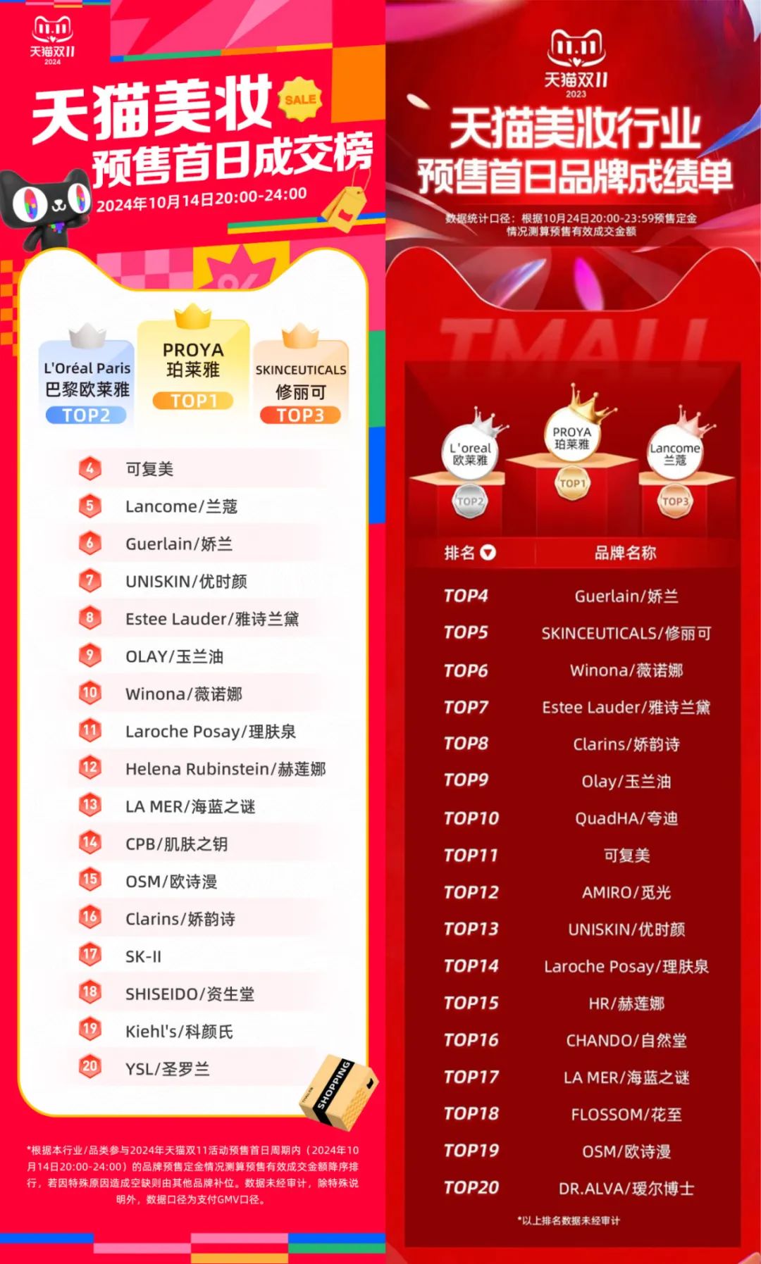左:2024年天貓雙十一預(yù)售榜單;右:2023年天貓雙十一預(yù)售榜單