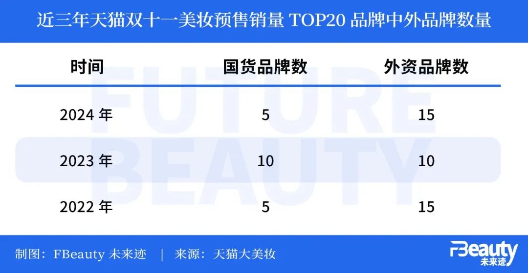 但仔細(xì)盤一盤,又能發(fā)現(xiàn)一些顯著的變化,例如國(guó)貨品牌在“雙11天貓美妝預(yù)售首日成交榜TOP20”中的席位,2024年對(duì)比2023年從10個(gè)下降到了5個(gè),外資品牌反而“扳回一城”。