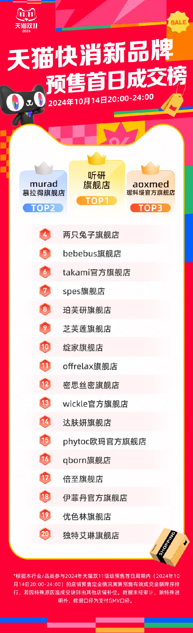 同時(shí),在今年雙十一“天貓快消新品牌預(yù)售首日成交榜”中,也能看到不少新銳國(guó)貨品牌的身影,例如位居第一的聽妍品牌,主營(yíng)美容護(hù)膚產(chǎn)品及美容儀,位居第三的璦科縵,是貝泰妮旗下聚焦醫(yī)美圍術(shù)護(hù)膚的高端品牌。此外,達(dá)膚妍、獨(dú)特艾琳等國(guó)貨品牌近年來發(fā)展也十分迅速。