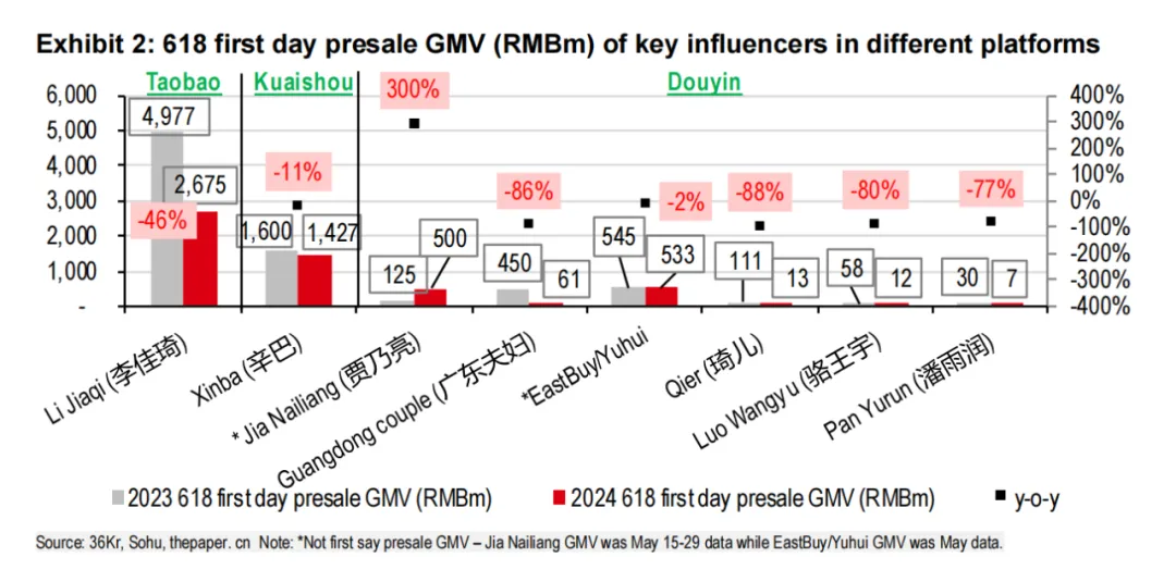 根據(jù)匯豐的618研報(bào)數(shù)據(jù),今年618多個(gè)頭部直播間的銷售額均出現(xiàn)了下滑:李佳琦預(yù)售首日美妝專場直播的GMV超26.75億元,相比去年的49.77億元,同比下降了46%;辛選今年的618直播中僅有10場銷售額破億,而去年這一數(shù)字是16場;根據(jù)飛瓜數(shù)據(jù),今年618大促抖音達(dá)人帶貨榜前三分別是廣東夫婦、賈乃亮和與輝同行,瘋狂小楊哥甚至沒能擠進(jìn)前十。