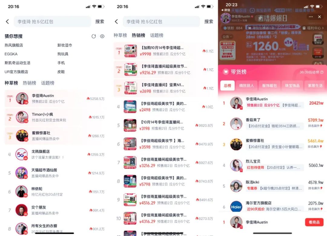 事實(shí)上,自14日上午7點(diǎn)半開始,李佳琦直播間在淘寶直播“種草榜”和“帶貨榜”就一直穩(wěn)居斷層第一。預(yù)售開始15分鐘,李佳琦直播間種草熱度達(dá)5000+,第二位的直播間僅1000+;熱銷榜TOP10產(chǎn)品鏈接,也全部來自于李佳琦直播間。預(yù)售開始約20分鐘,李佳琦帶貨榜熱度值突破2萬,比榜單第二高出1.5萬。