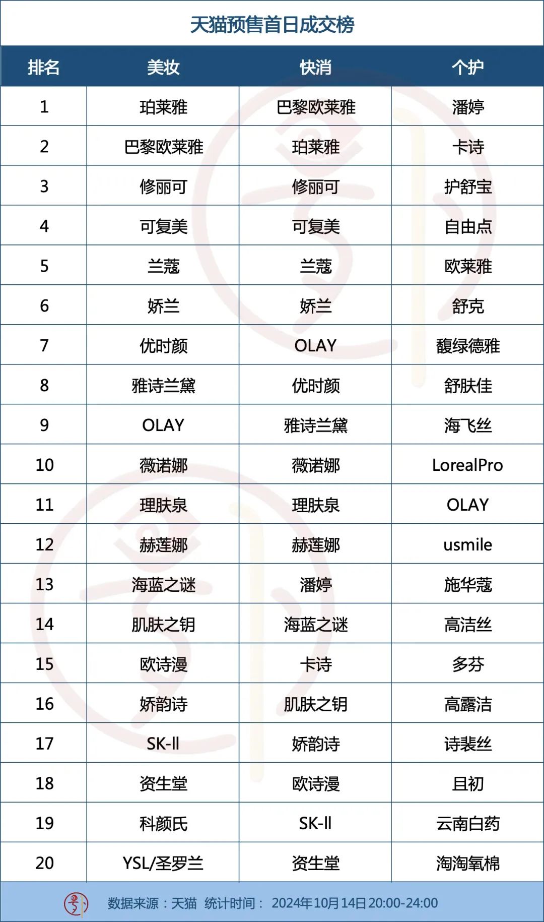 珀萊雅第一,巴黎歐萊雅第二。從天貓雙11預(yù)售首日成績單來看,珀萊雅繼續(xù)蟬聯(lián)第一,巴黎歐萊雅則位居第二,第三則被修麗可占據(jù),去年位列榜單第三的蘭蔻此次則下滑至第五名。