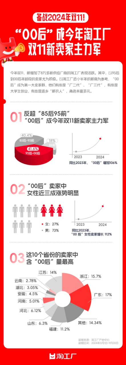 來(lái)自淘工廠產(chǎn)地中心數(shù)據(jù)(2024年5月1日至9月30日)顯示,以“84前”、“85后-95前”以及“95后-00后”三個(gè)區(qū)間段做區(qū)分,淘工廠今年備戰(zhàn)雙11的新賣家中,“84前”占比18%,“85后-95前”占比40.4%,“95后-00后”以41.6%的占比略勝“85后-95前”,成為今年備戰(zhàn)雙11的主流新勢(shì)力賣家,同比去年,增長(zhǎng)了106%,成為最活躍新賣家群。其中,女性賣家也呈增長(zhǎng)趨勢(shì),已經(jīng)接近新賣家近三成。