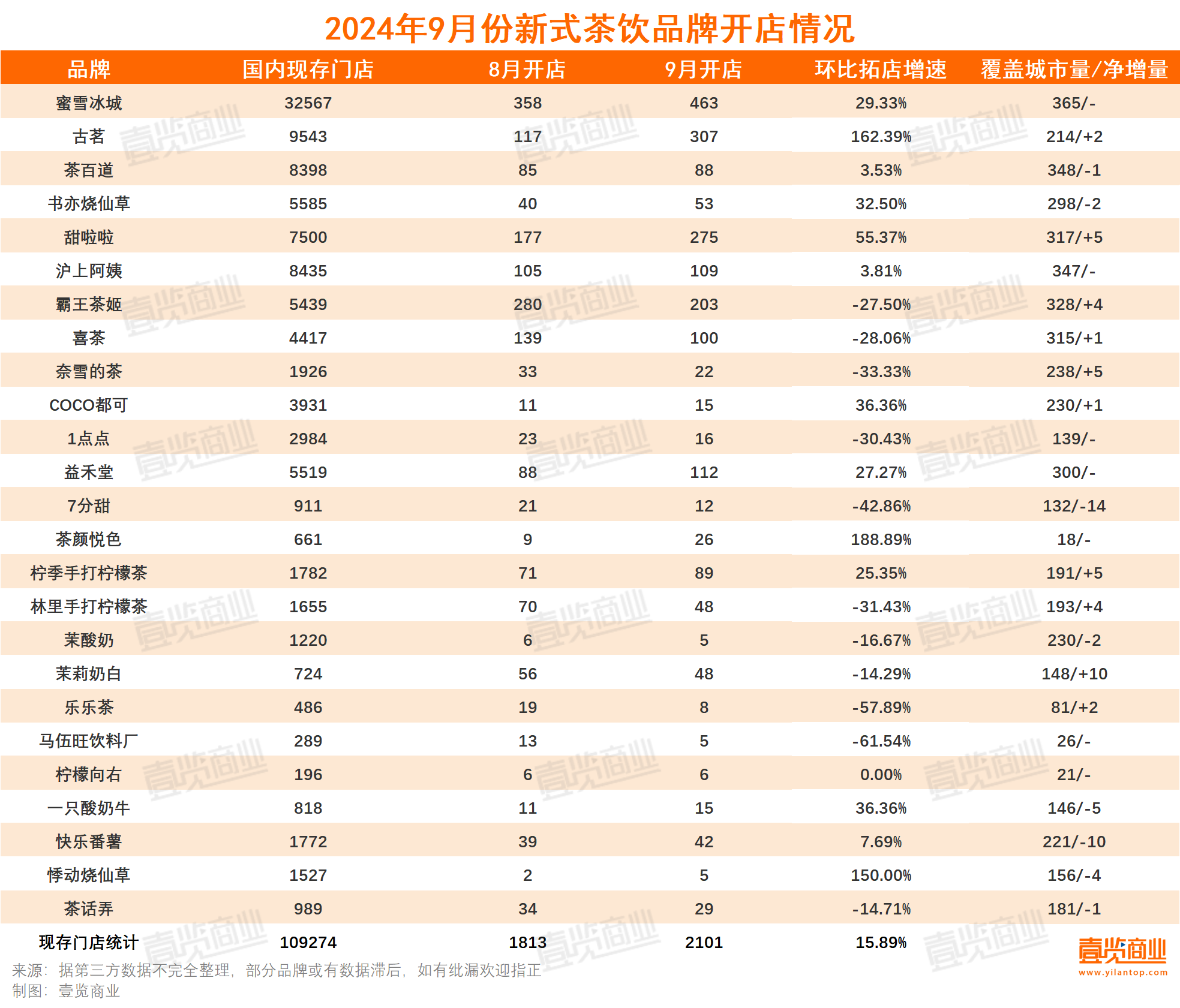 從整體開(kāi)店數(shù)量來(lái)看,國(guó)內(nèi)25家連鎖茶飲品牌一共新開(kāi)門(mén)店2101家,現(xiàn)存門(mén)店一共109274。