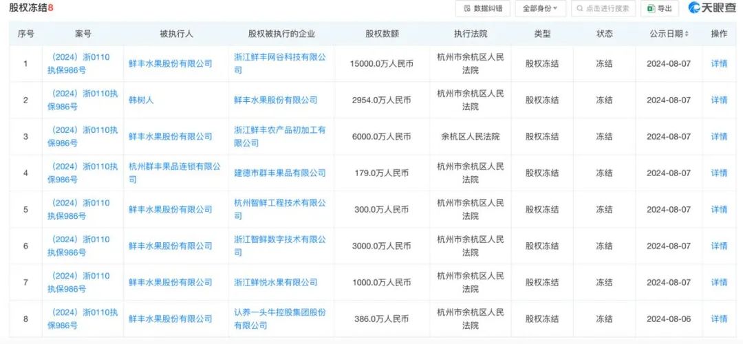 根據(jù)天眼查信息,目前,與鮮豐水果相關有8條股權凍結記錄,凍結股權數(shù)額超過2.8億元,執(zhí)行法院均為杭州市余杭區(qū)人民法院,凍結期限為3年,執(zhí)行事項均系公示凍結股權、其他投資權益。