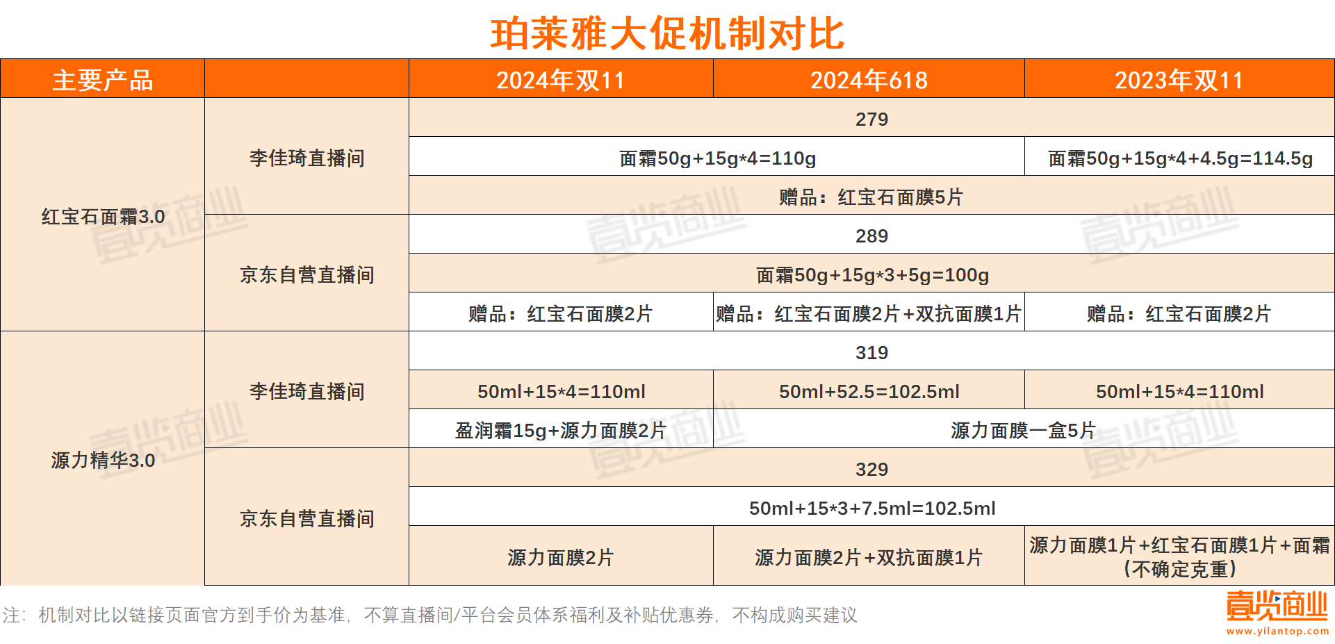 壹覽商業(yè)對(duì)比了珀萊雅今年雙11、618及去年雙11在李佳琦直播間、京東自營(yíng)直播間的機(jī)制發(fā)現(xiàn),珀萊雅的贈(zèng)品正在“縮水”。