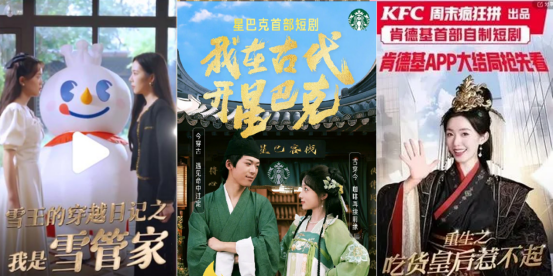 肯德基短劇《重生之吃貨皇后惹不起》的吉國皇后因偷吃雞腿被雞嚇到穿越,重生成為人氣女演員周莫,由此開啟翻身逆襲的大女主之路;《我在古代開星巴克》中身為星巴克店員的男主意外穿越,靠著帶來的咖啡豆和星巴克品牌手冊在古代開起了“星巴客!;蜜雪冰城直接將重生戲路拉滿,從重生之我是雪舞王到雪管家、雪特助、雪團寵,每天忙著穿越不停。