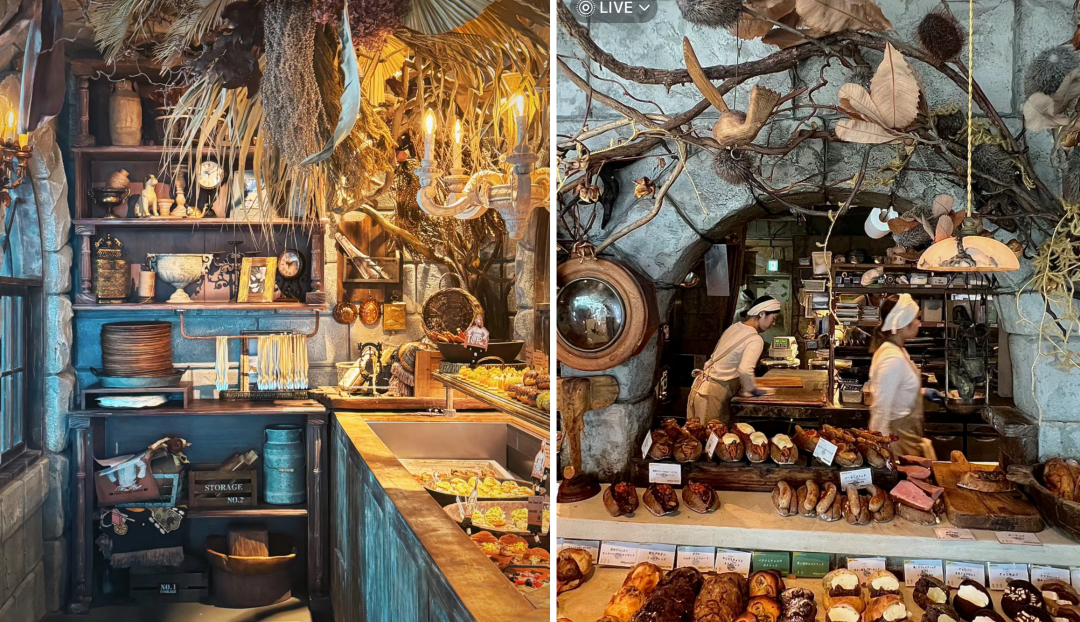 同樣的開放式面包柜臺(tái),石頭墻上纏繞著枝條與干花,輔助暖色燈光,營造出故事書里的魔法面包店。