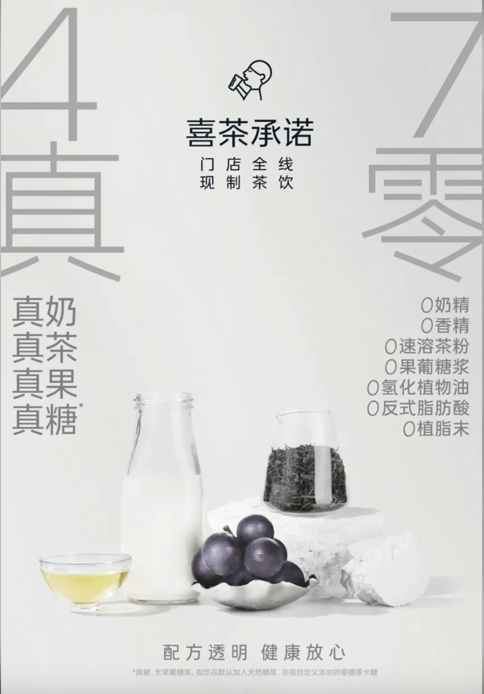 7月22日,喜茶發(fā)布了行業(yè)最嚴格的“四真七零”健康茶飲標準。該標準明確提出健康真茶飲應該是以“真茶、真奶、真果、真糖”為原料,全線產(chǎn)品符合“0奶精、0香精、0果葡糖漿、0植脂末、0氫化植物油、0反式脂肪酸、0速溶茶粉”的要求,作為始終堅持真品質(zhì)的品牌,喜茶全線在售現(xiàn)制飲品均符合“四真七零”健康茶飲標準。