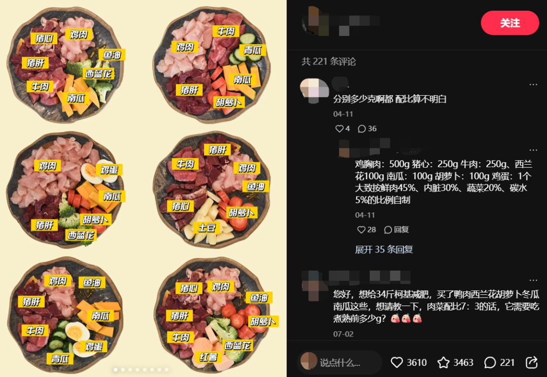 社交平臺上,經(jīng)常有網(wǎng)友討論各品牌寵糧配方的營養(yǎng)度,以及相適應(yīng)的寵物群體!按值鞍缀坎荒艿陀35%,但太高了會對腎臟造成負擔(dān)”、“粗纖維不能高于8%,否則會造成腹瀉”、“最好還是五谷配方”……養(yǎng)寵人不僅要求寵糧里添加多種鮮肉源,還要足夠分量的果蔬和營養(yǎng)元素。