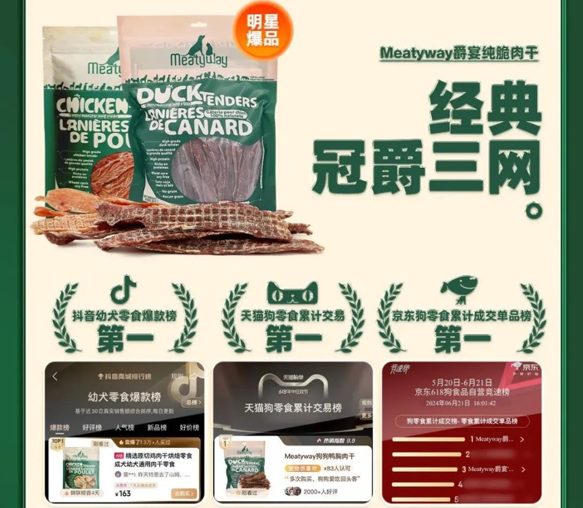 中寵股份先后收購了新西蘭高端品牌“ZEAL”,以及國內(nèi)主打中高端的互聯(lián)網(wǎng)新銳品牌“Toptrees領(lǐng)先”;佩蒂股份也推出了針對高端狗糧市場的子品牌“爵宴”,強調(diào)食材的天然有機,爵宴的核心大單品鴨肉干,推出后一直在各平臺銷量保持前列。