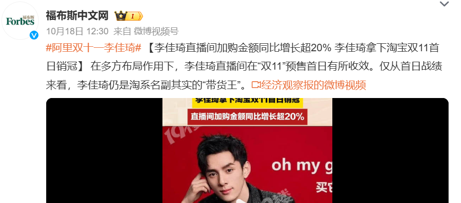 圖:2024年雙11李佳琦首日戰(zhàn)報(bào),來源:福布斯中文網(wǎng)微博