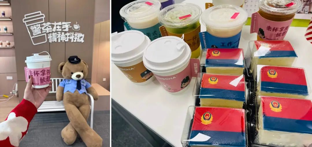 今年年初,蘇州公安推出了自主品牌“警茶”。其logo以警茶盾牌為原型,融入了茶元素,剛中帶柔,兼具時尚與美感;產(chǎn)品上有美式、拿鐵等多種選擇,小蛋糕也是中國警旗的樣式。