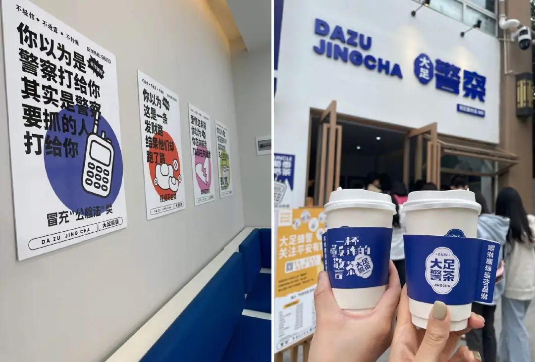 獨(dú)特的位置搭配經(jīng)典的藍(lán)白配色,以及“一杯懂反詐的茶”的slogan,暗中揭示了奶茶店的“編制地位”。