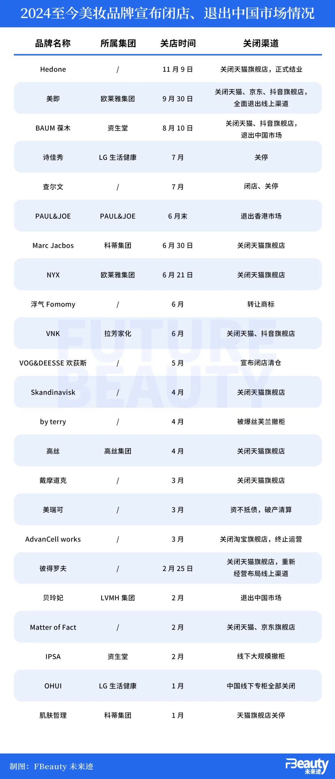與此同時(shí),市場陣痛的現(xiàn)象已經(jīng)越來越明顯!禙Beauty未來跡》不完全統(tǒng)計(jì)發(fā)現(xiàn),截至今年10月,已經(jīng)有23個(gè)品牌宣布關(guān)閉門店、退出中國市場或品牌倒閉,其中除了浮氣fomomy、HEDONE、VNK等中小國貨彩妝品牌之外,也不乏LVMH、資生堂、科蒂、LG生活健康、歐萊雅等外資大集團(tuán)的品牌。
