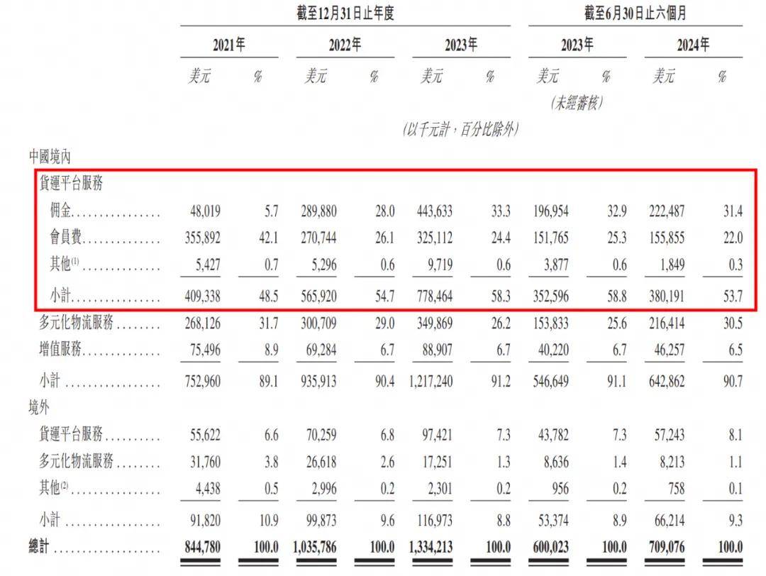 招股書顯示,貨拉拉從2021年至2023年期間,平均月活司機人數(shù)分別為82萬、91萬及121萬。作為貨拉拉的第一大收入來源,2024年上半年,貨運平臺服務(wù)占據(jù)中國境內(nèi)總收入的比例為53.7%,而這部分收入,主要就靠向司機收取傭金、會員費,兩項收入分別占31.4%、22.0%。