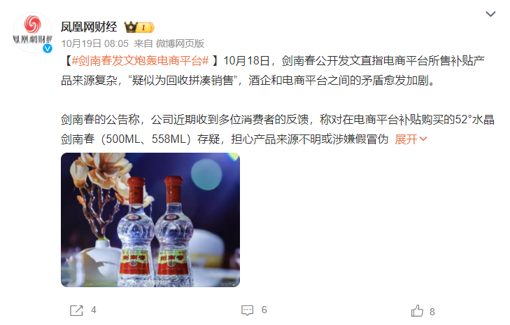 劍南春發(fā)文“炮轟”,白酒企業(yè)和電商平臺“矛盾”難解