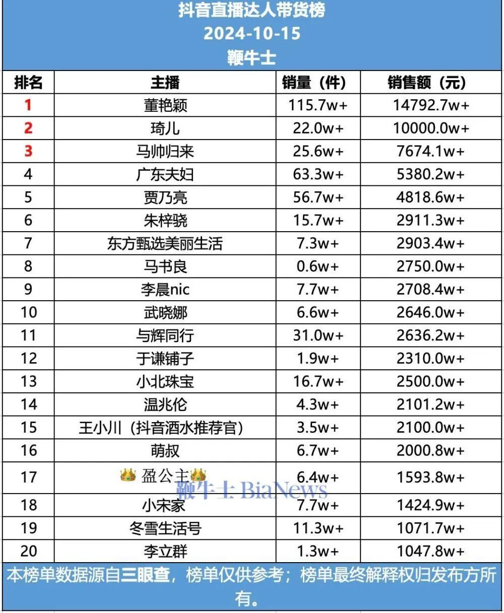 10月15日,主播董艷穎悄然嶄露頭角,一舉拿下抖音平臺(tái)銷冠。據(jù)鞭牛士的抖音數(shù)據(jù)顯示,當(dāng)日董艷穎的銷售額接近1.5億元,銷量超過115.7萬件,力壓廣東夫婦、賈乃亮、與輝同行等知名主播,登頂直播帶貨日榜。