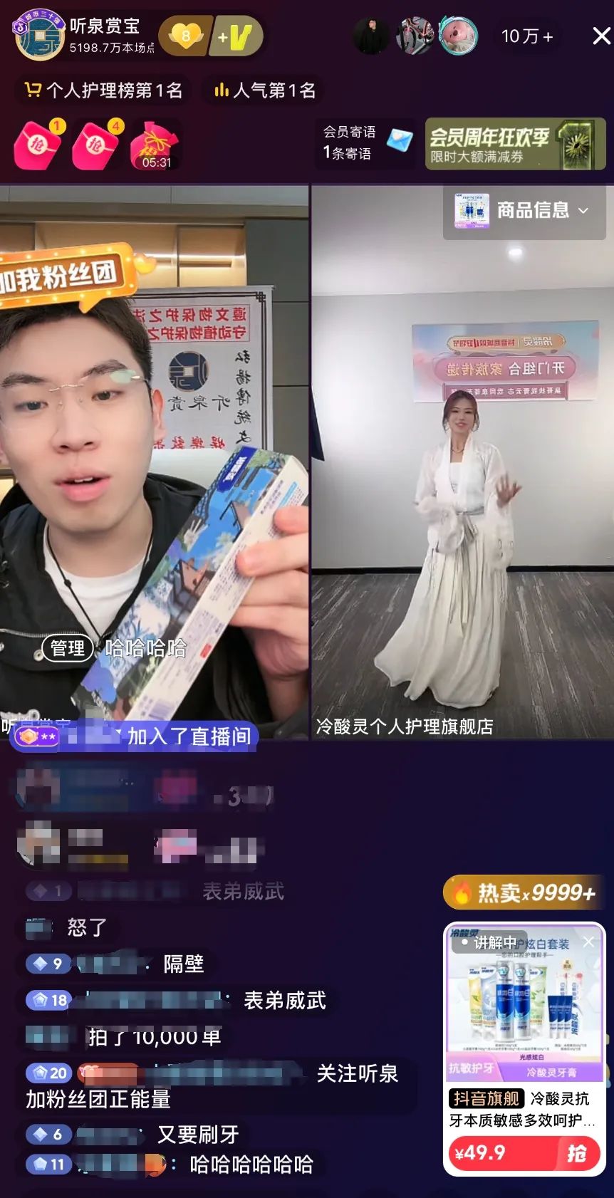 10月18日,聽泉在抖音平臺(tái)正式開啟了其直播帶貨的首秀之旅。開播僅僅幾分鐘,直播間便涌入了大量觀眾,冷酸靈、歐萊雅、藍(lán)月亮、七度空間等眾多知名品牌紛紛刷禮物,占據(jù)打賞榜單前列,為這場(chǎng)直播增添了不少熱度。