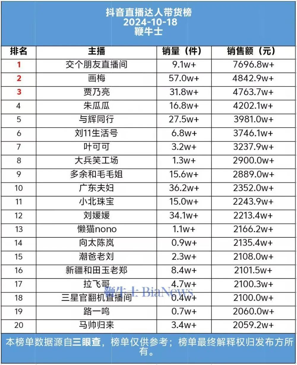 然而,值得慶幸的是,抖音平臺(tái)上的其他頭部主播帶貨能力依然穩(wěn)健,部分還有所進(jìn)步。