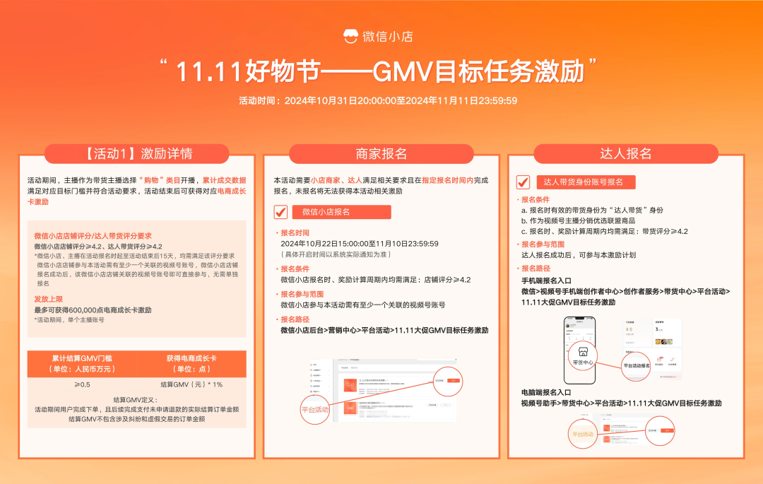 日前,微信小店便發(fā)布了《微信小店11.11好物節(jié)活動(dòng)激勵(lì)計(jì)劃》,分為GMV目標(biāo)任務(wù)激勵(lì)、跨店每滿(mǎn)50元減5元優(yōu)惠激勵(lì)、11.11主會(huì)場(chǎng)展示三項(xiàng)活動(dòng)。參與活動(dòng)最高獲60萬(wàn)點(diǎn)流量激勵(lì),滿(mǎn)減活動(dòng)商品技術(shù)服務(wù)費(fèi)率減至1%。