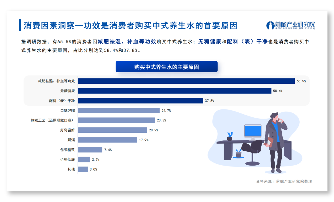 前瞻產(chǎn)業(yè)研究院的一份報告中也指出,消費者購買中式養(yǎng)生水的第一大原因就是看中了減肥祛濕、補血等功效。加上國人對于“藥食同源”信手拈來,中式養(yǎng)生水便絲滑切入養(yǎng)生飲品賽道。