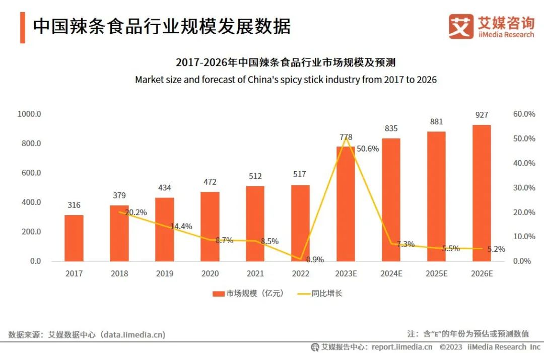 對比而言,高鹽、高油、高熱量的辣條背離了消費(fèi)者健康飲食的需求,自然難逃銷量走低的宿命。艾媒咨詢披露的數(shù)據(jù)顯示,預(yù)計2024年-2026年,中國辣條食品市場規(guī)模同比增速均為個位數(shù),相較此前幾年的雙位數(shù)增速,大幅回落。