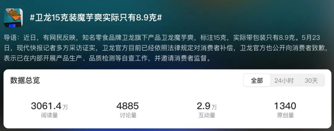 隨后,話題“衛(wèi)龍15克裝魔芋爽實(shí)際只有8.9克”登陸微博熱搜榜,收獲超3000萬閱讀量。諸多網(wǎng)友紛紛表示,“衛(wèi)龍又貴又難吃”“ 這么貴還缺斤少兩,真是黑心商家”。