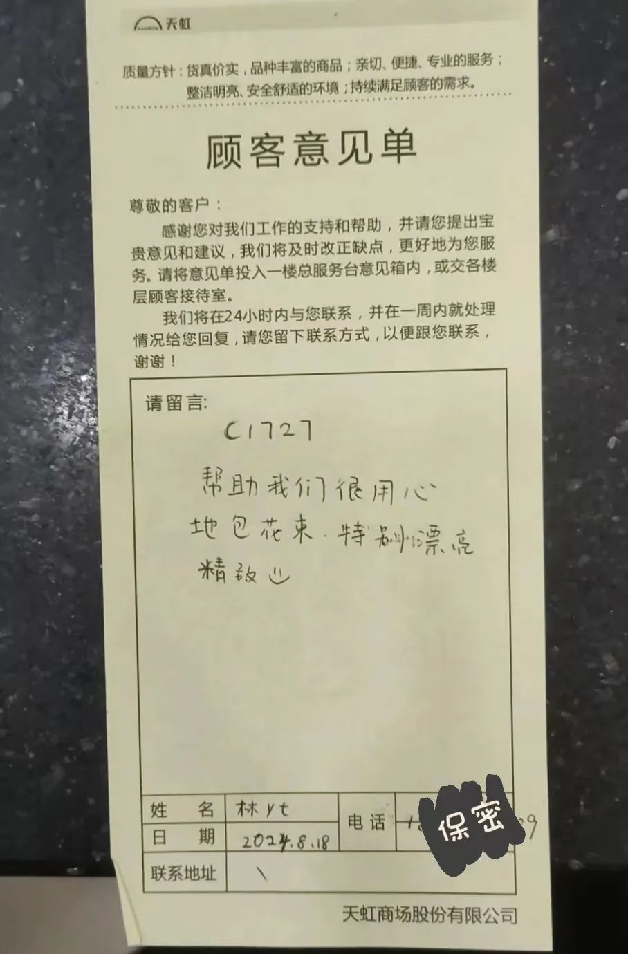 8月18日,一名顧客到客服臺包裝鮮花,謝夢茹出于對顧客要求與鮮花嬌嫩特質(zhì)的考慮,對花束進(jìn)行了精心固定、修剪,按層次包裝。顧客對花束呈現(xiàn)的效果和夢茹的熱情服務(wù)非常滿意,特意寫下感謝信,表示以后都會在天虹購買鮮花。