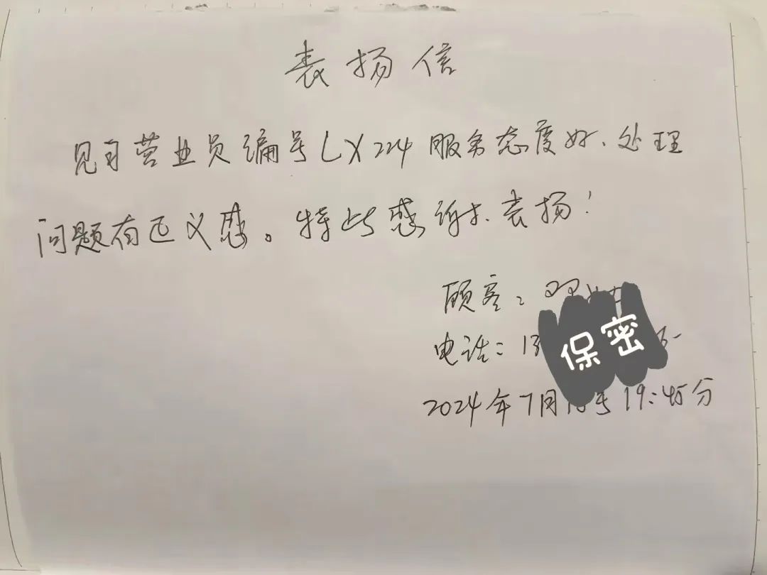 7月18號晚,有顧客投訴某品牌衣服褪色,有質(zhì)量問題且對導(dǎo)購處理不滿意。張景麗馬上熱情接待,遞上茶水安撫顧客情緒,認(rèn)真聆聽并了解事情經(jīng)過后,陪同顧客前往柜臺溝通協(xié)調(diào)。事后,顧客對張景麗在整個服務(wù)過程中的態(tài)度以及處理結(jié)果表示非常滿意,特意寫下了一封表揚信!