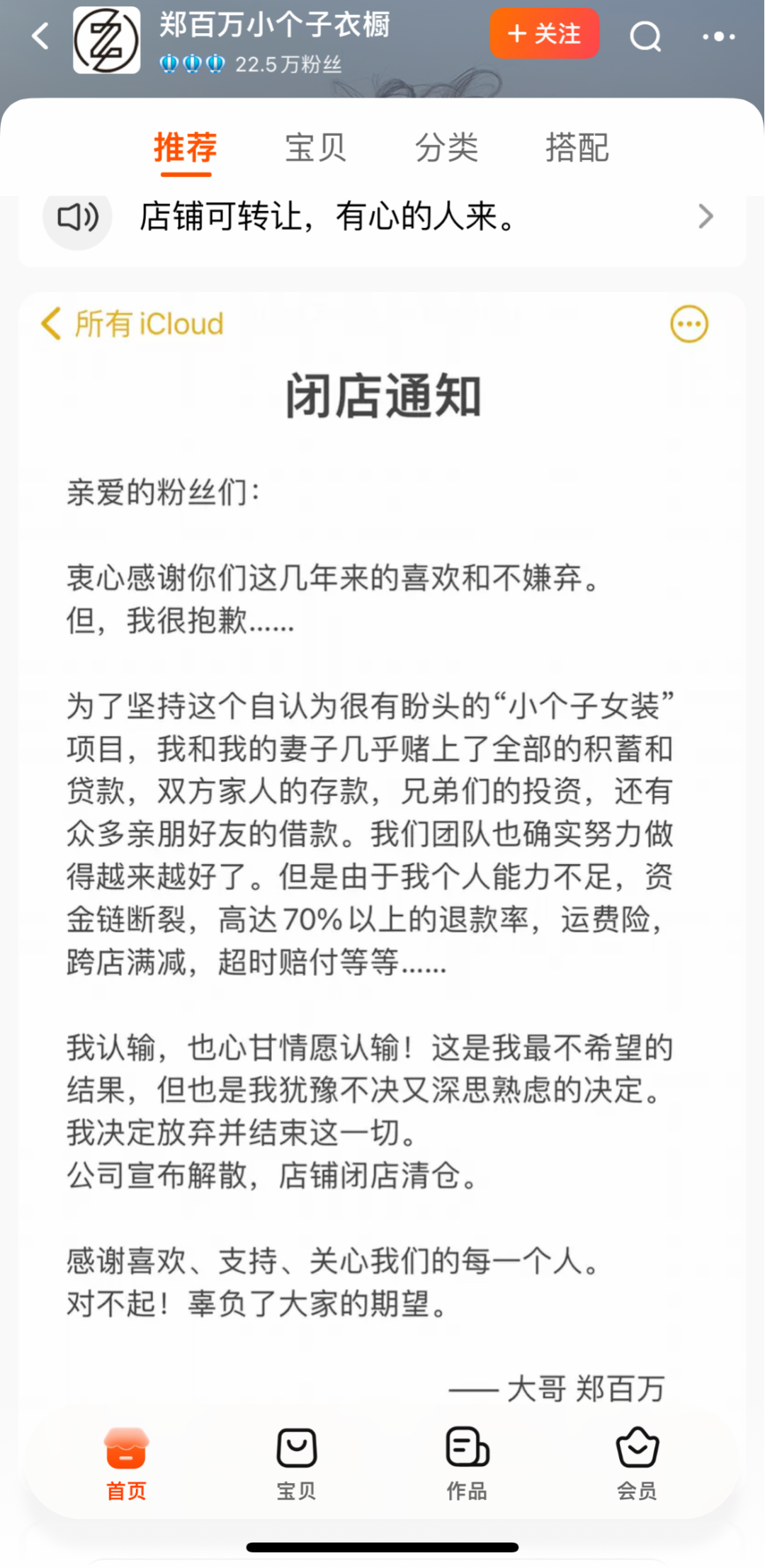 無獨(dú)有偶,大約半個(gè)月前,在淘寶的小個(gè)子女裝店鋪黑馬榜排名TOP9的店鋪“鄭百萬小個(gè)子衣櫥”,也宣布關(guān)店了。該商家在閉店通知中表示,由于資金鏈斷裂、高達(dá)70%的退款率,以及各種運(yùn)費(fèi)險(xiǎn)、跨店滿減等,只能無奈解散公司,閉店清倉。