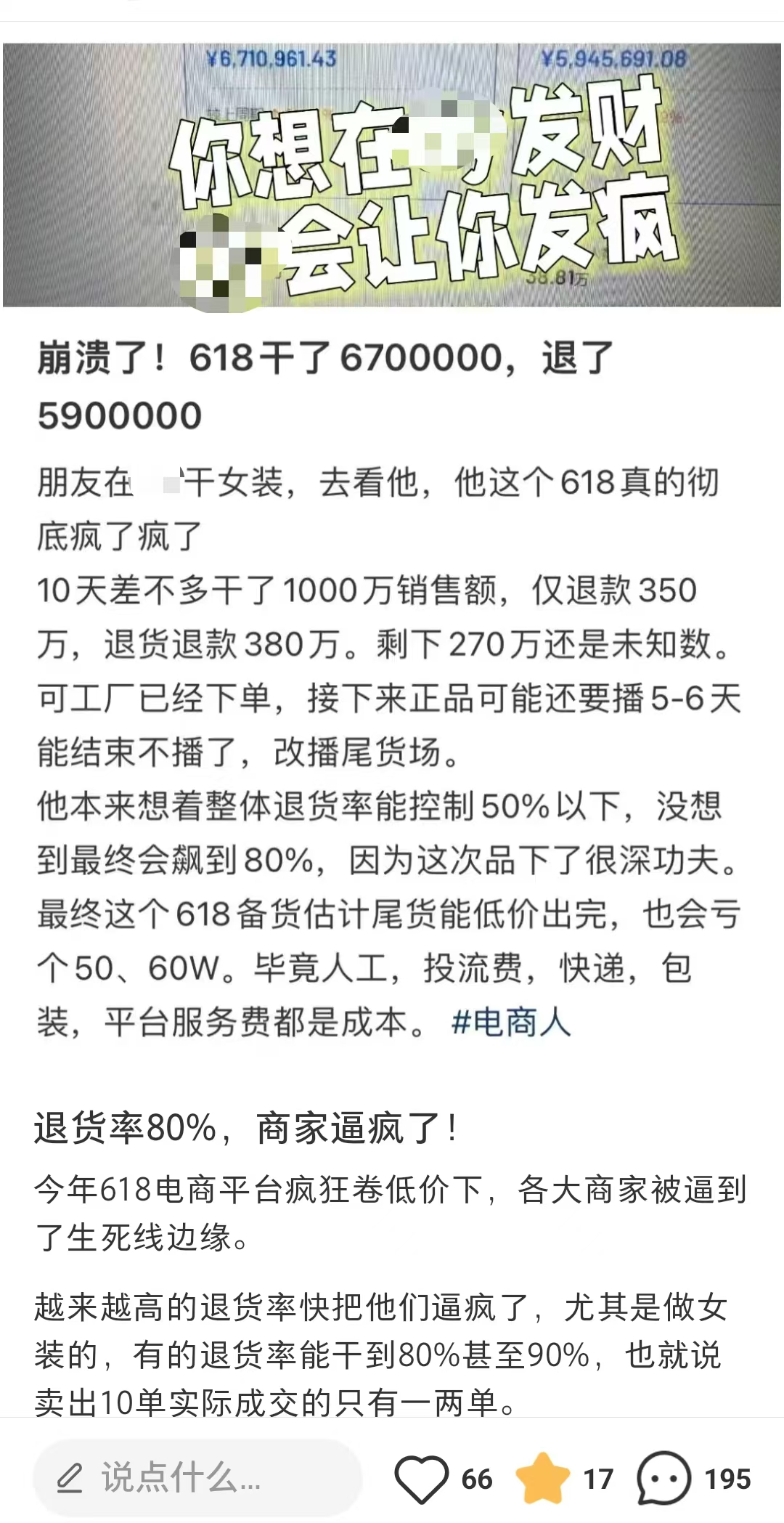 有網(wǎng)友爆料稱,今年618期間,朋友的女裝網(wǎng)店創(chuàng)下了1000萬元左右的營業(yè)額,但扣掉僅退款的350萬元、退貨退款的380萬元,再刨除人工、投流費(fèi)、快遞包裝等各項(xiàng)成本開支,預(yù)計(jì)虧損50萬元到60萬元,退貨率也從最初預(yù)計(jì)的50%以下,最終飆到了80%。