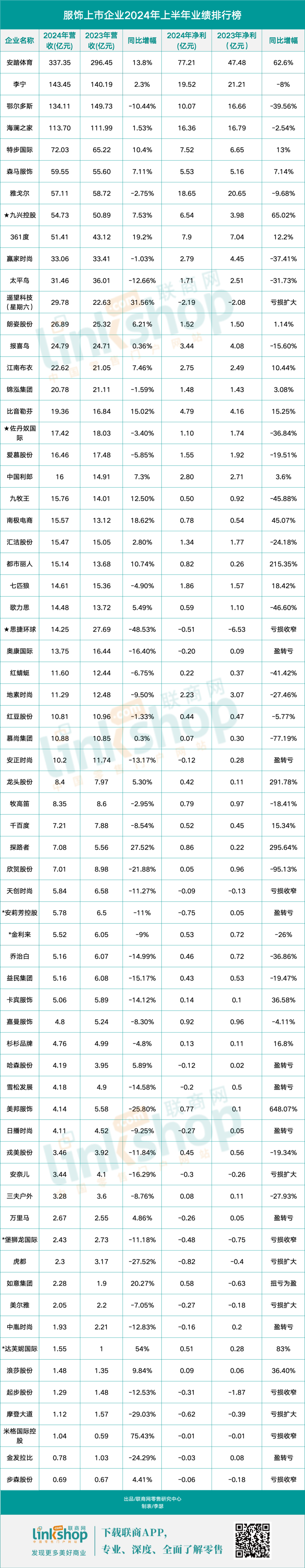 其中,安踏、李寧、鄂爾多斯、海瀾之家上半年?duì)I收超百億,安踏超300億。