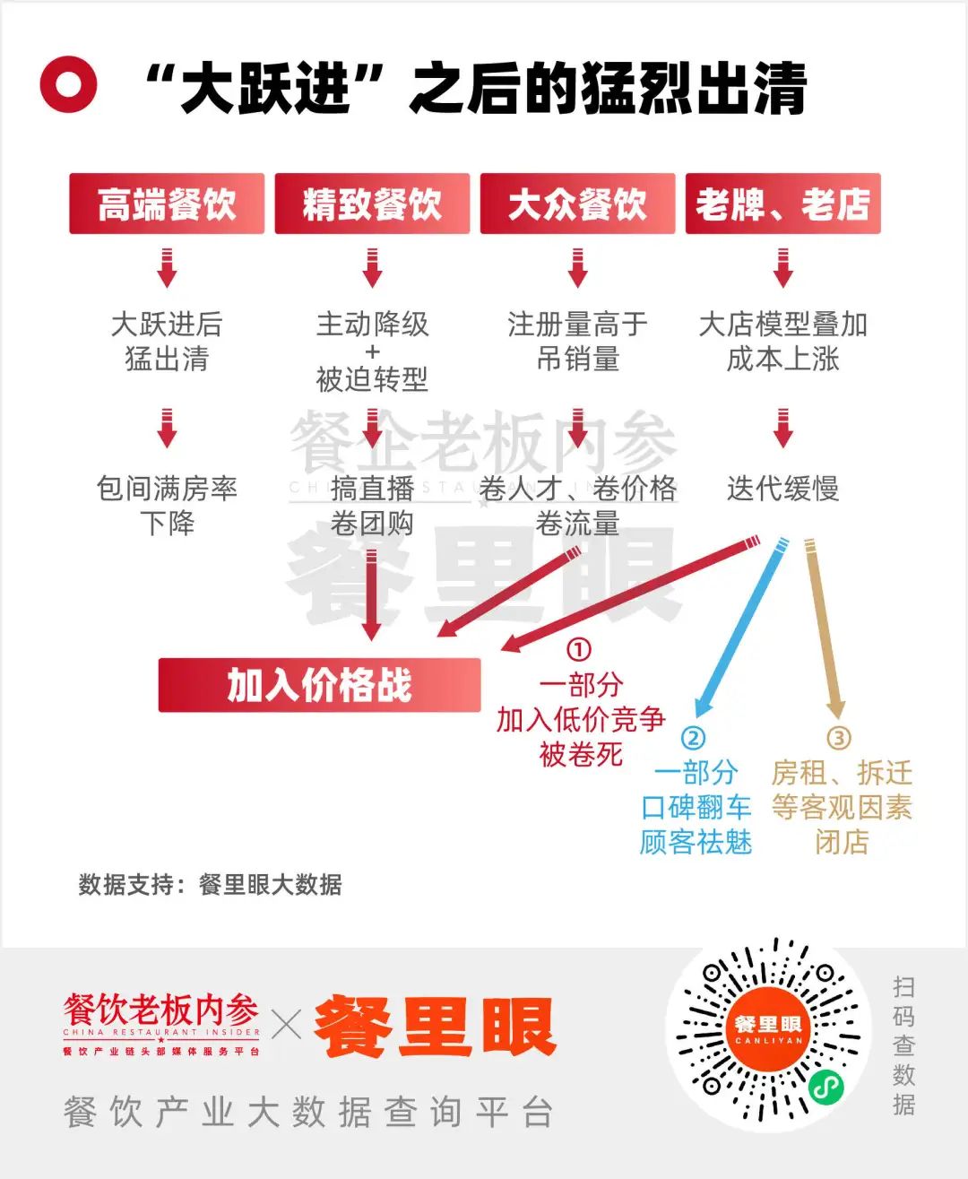 除了自身存在的“基因”限制。競爭環(huán)境的險惡,也再度讓這些老牌餐廳雪上加霜;貧w底層原因,疫情之后,餐飲經(jīng)歷了一輪“大躍進(jìn)”階段,這個激進(jìn)的過程,進(jìn)一步加速了餐飲行業(yè)的淘汰率,導(dǎo)致各個價格帶、品類陸續(xù)出清。