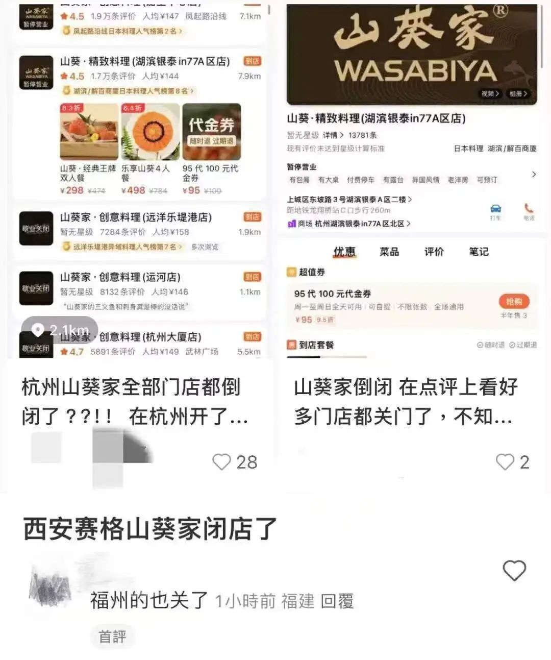 杭州創(chuàng)意料理“山葵家”,成立于2011年,旗下多個品牌,擁有直營門店40余家。近日,也被網(wǎng)友爆料,一夜之間關(guān)閉了大量門店。不僅如此,“幾百名員工工資被拖欠、供應(yīng)商欠款高達(dá)百萬元,老板還跑路了”。